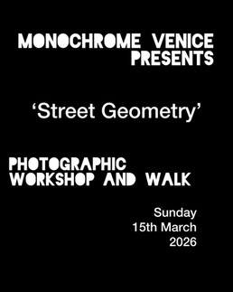 A follow up to the success of 'Venice Street Geometry' photography exhibition held in Venice at the Kunst Depot Venezia in 2025, the workshop and walk leads you through the skills and practice of reading the light and shadow, using existing street architecture and choosing the correct vantage point to capture shots that are unique and timeless.